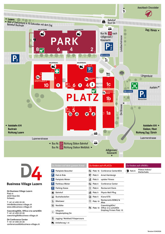 Auf der Autobahn A14 von Zürich nach Luzern, nehmen Sie entweder die Ausfahrt 3 Buchrain-Ebikon Richtung Root D4 und fahren Sie 1.3 Kilometer auf der Kantonsstrasse bis Root D4, oder nehmen Sie die Ausfahrt 4 Gisikon-Root Richtung Luzern und fahren Sie 3 Kilometer auf der Kantonsstrasse bis Root D4. Parkplätze sowie E-Ladestationen sind kostenpflichtig vorhanden.