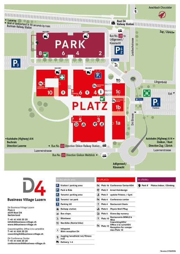 The D4 Business Village Luzern is served by regular connections every 30 minutes from Zurich Airport, Zurich city, Bern, Basel, Geneva and Lucerne. Change to the S-Bahn (S1) in Lucerne, Zug or Rotkreuz and get off at the Root D4 stop.